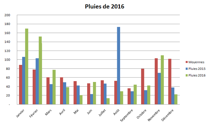La pluviométrie des mois de décembre, janvier et février a été de 400mm. la moyenne depuis 1997 est pour ces trois mois de 270mm, soit un exédent de 50%.Mais les jours de pluie, sont presque dans la moyenne 7jrs pour 10 les températures minimales de février sont de 1.5°c au dessus de la moyenne, mais les températures max 10.5°c sont dans la moyenne