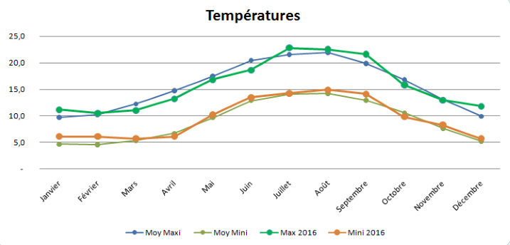 Mois le plus chaud : Aout avec une moyenne mensuelle de 18.1°c