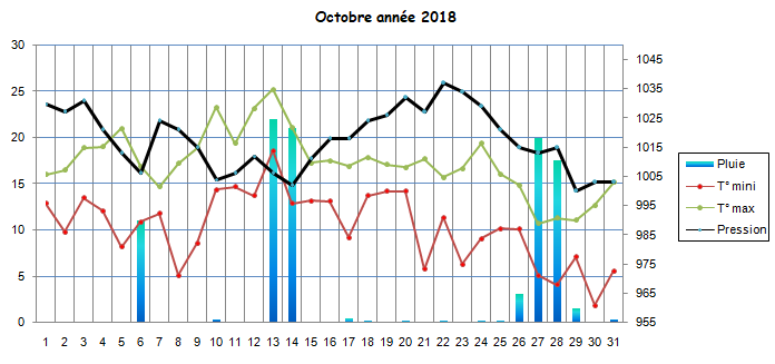 Jour le plus chaud du mois :le 13 octobre avec une moyenne journalière de + 21.1°c