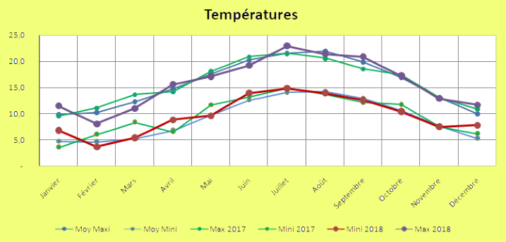 Mois le plus chaud : Septembre avec une moyenne mensuelle de 18.7°c