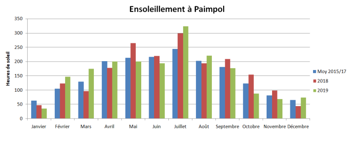Heures de soleil sur le mois :Â 256H, 19jours>50% dont 12>80%