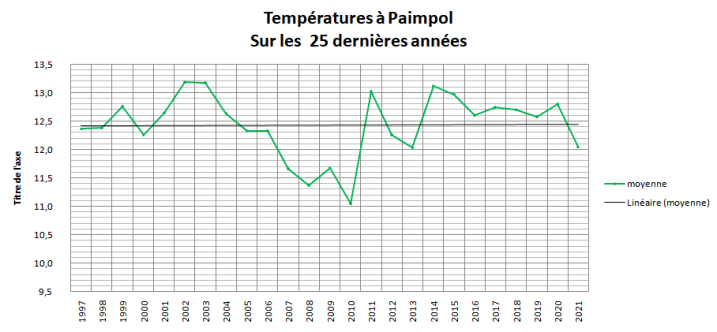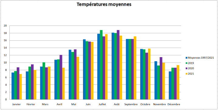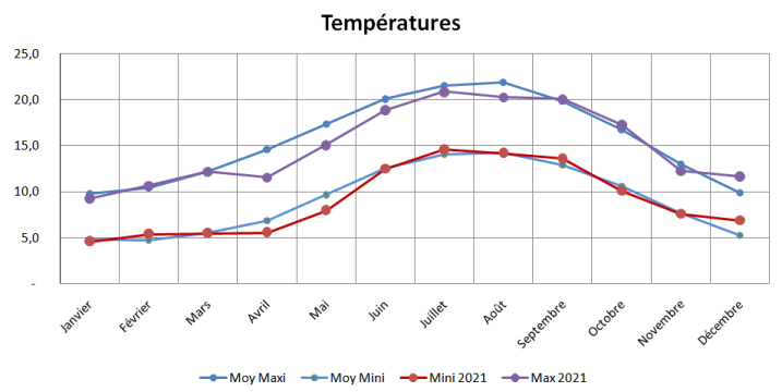 La température moyenne de 2021 ; 12.1° aura été la plus fraiche de ces quatre dernières années. Alors que les années depuis 2014 avaient été les plus chaudes.