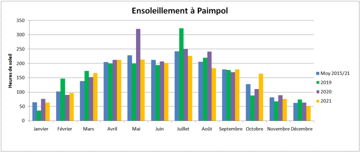 Cumul heures de soleil sur l'année : 1544h léger déficit de 30h sur la moyenne 2015/2021