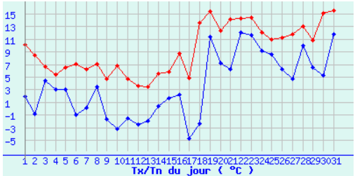 Jour le plus froid du mois :le 17 avec une moyenne journalière de 1°c