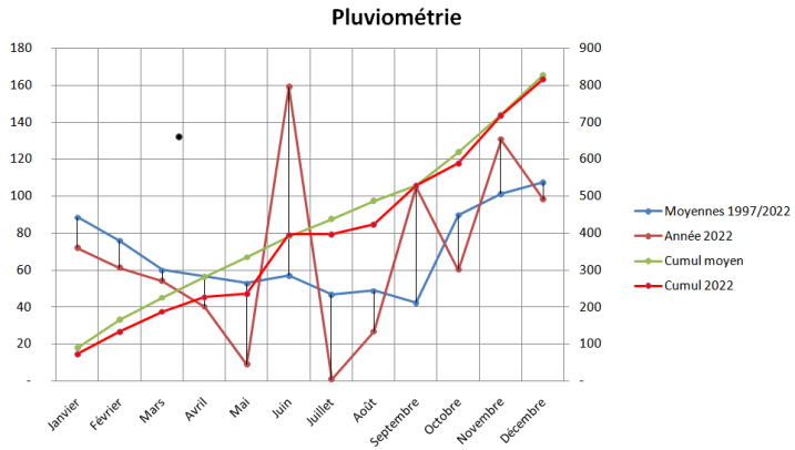 Mars 32mm (50mm) avril 28mm (57mm) ont été des mois plus sec que la moyenne ainsi que Juillet 37mm (49mm) et aout 20mm (50mm)