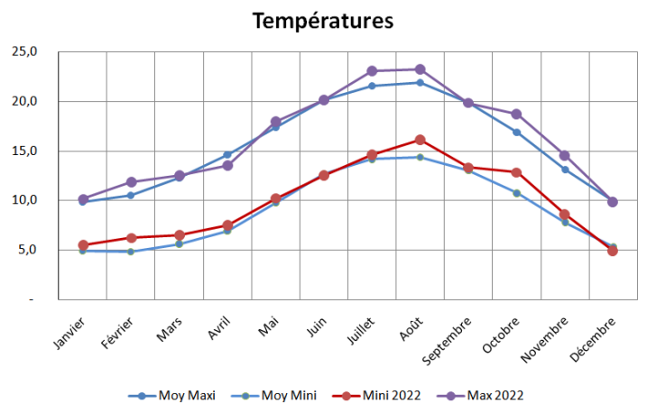 Jour le plus chaud du mois : le 22 avec une moyenne journalière de 12.6°c
