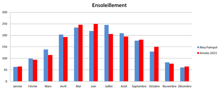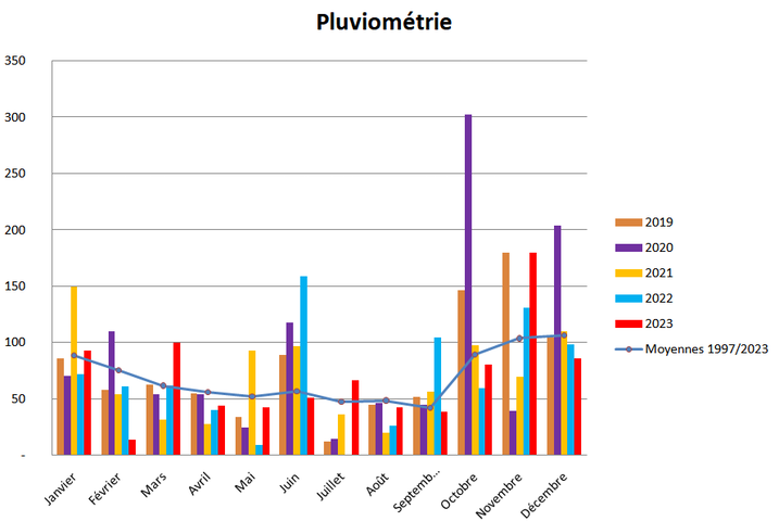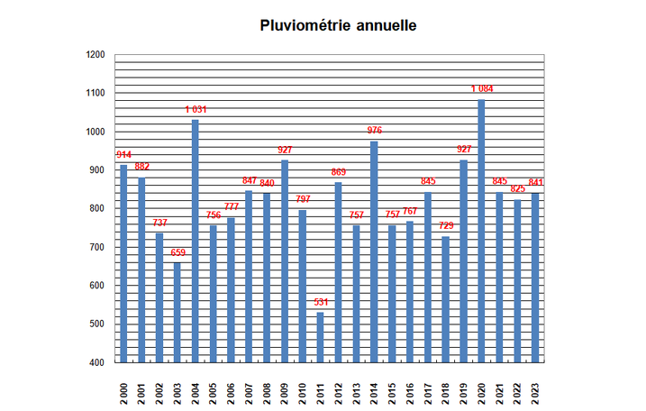 Cumul pluviométrique annuel :829mm, 531mm (2011)à 1084mm (2020)