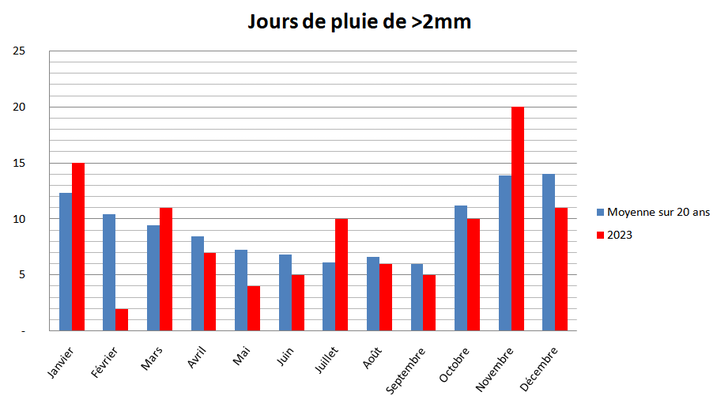Nombre de jours de pluies de >2mm . Sur les 20 dernière années :105jrs, 72jrs en 2011 à 140jrs en 2004 . Le record est 162jrs en 2002