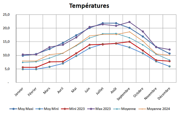Température moyenne annuelle:12,5°c, 11°c (2010), 13,2°c (2002),